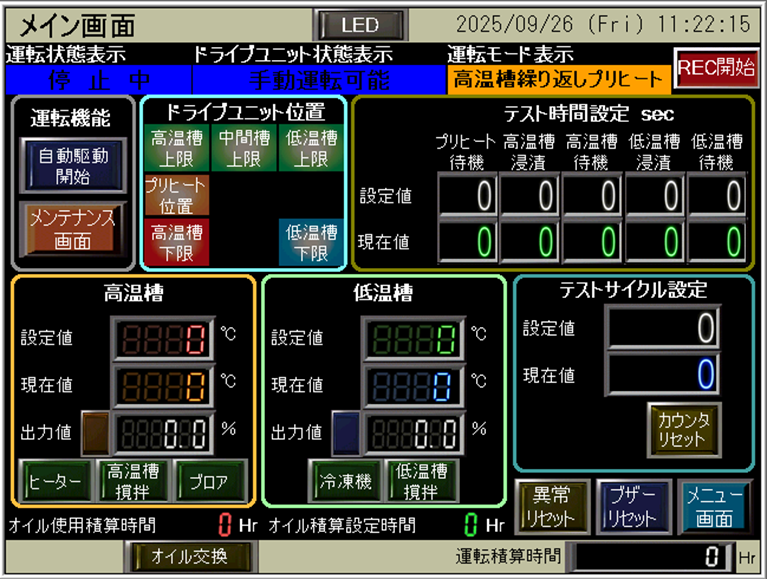 運転モードについても、初回から高温でのテスト可能な運転モードがあり、液相の温度設定やサイクル時間設定も、タッチパネル操作で簡単に設定可能です。