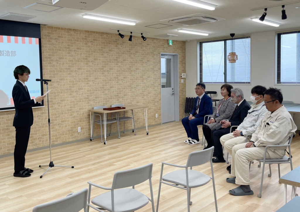 令和8年度入社式 お知らせ 2026.04.08 4月1日に令和8年度入社式を執り行い、3名の新入社員を迎え入れました。 社長から、これまでの学校生活とは異なる環境になりますが、前向きに粘り強く挑戦してほしいと、温かく力強いエールが送られ、新入社員からの決意表明では、これから始まる社会人生活と、ものづくりへの意気込みが感じられました。 新入社員の皆様、改めまして入社おめでとうございます。ものづくりのすばらしさを通して、新たな価値に一緒に挑戦しましょう! 皆様のご活躍を心より期待しています。